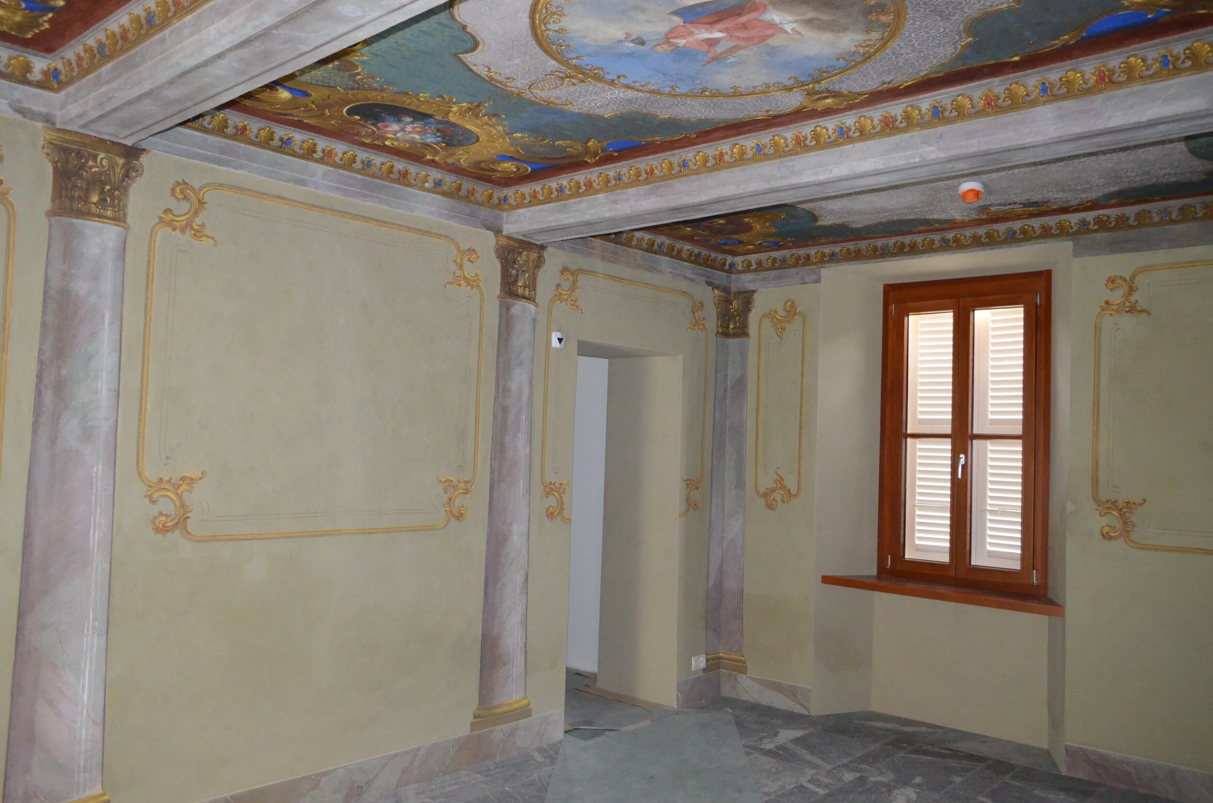 Locale con stucchi e cornici e camino in marmo d’Arzo